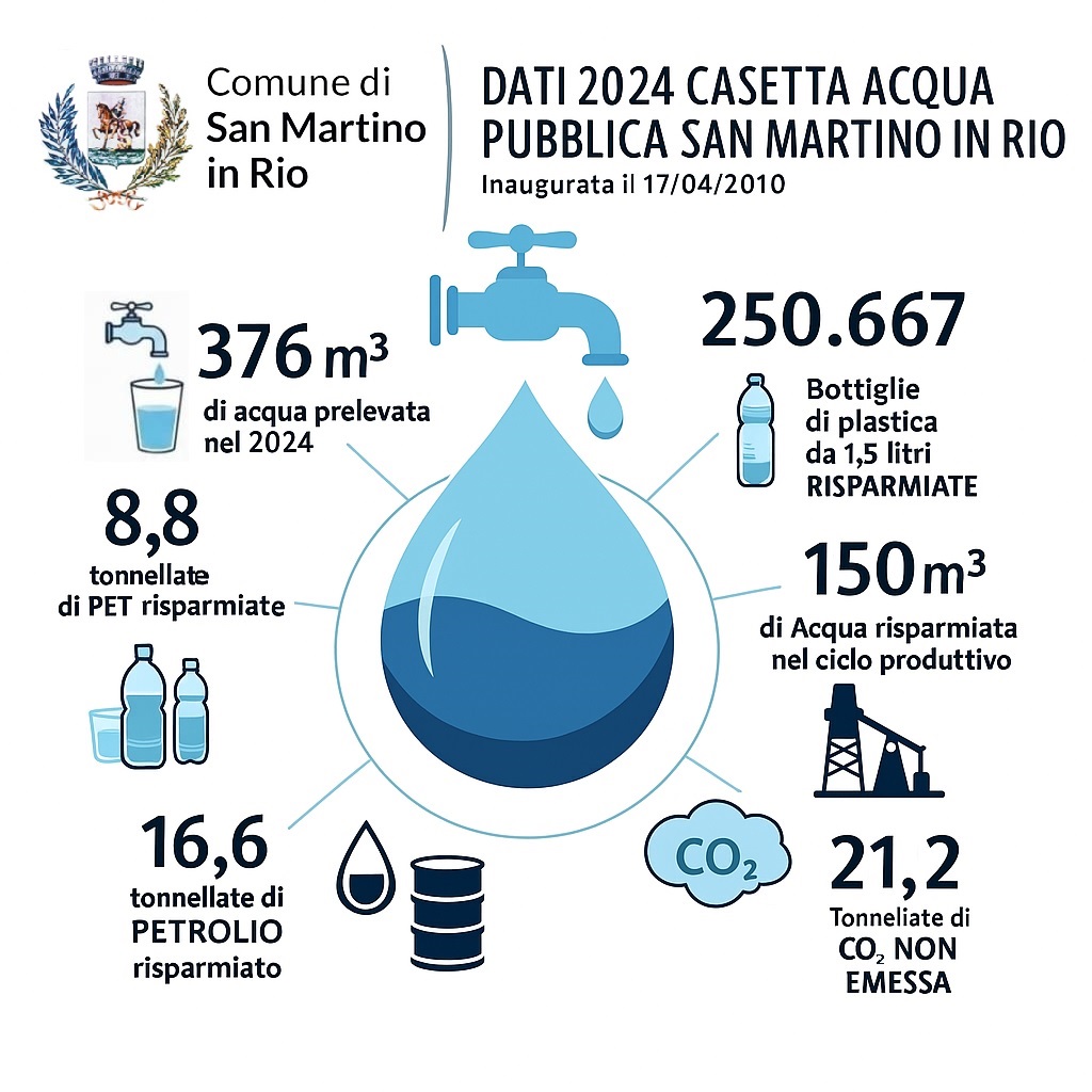 L'impegno collettivo dei cittadini di San Martino in Rio si traduce : nel 2024, la Casetta dell'Acqua pubblica di Via Rubiera, posizionata nel parcheggio in angolo con via Roma, ha permesso di risparmiare 250.667 bottiglie di platica